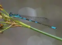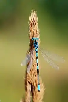 The dainty damselfly (Coenagrion scitulum), also known as the dainty bluet, is a blue damselfly of the family Coenagrionidae. This is a scarce species found mainly in southern Europe, northern Africa, southwest Asia, and Central America. C. scitulum are Odonata (dragonflies & damselflies) predators that can reach a length of 30–33 mm at maturity and have hind-wing lengths of 15–20 mm.[2] The males and females do exhibit differing features through their colouration making them easily distinguishable. As shown in the photo to the left, segment eight is blue in colour followed by black markings on segment nine, whereas the females are mostly black near the rear with smaller blue markings.[3] Although they are relatively simple to sex, they are easily confused with the common blue damselfly.[3]