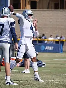 Rayne Dakota Prescott[1] (/ˈdæk/; born July 29, 1993) is an American football quarterback for the Dallas Cowboys of the National Football League (NFL). He played college football at Mississippi State, where he twice received first-team All-SEC honors, and was selected by the Cowboys in the fourth round of the 2016 NFL Draft. Prescott ranks fourth all-time in completion percentage with at least 1,500 pass attempts,[2] and is fifth in the NFL's all-time regular season career passer rating.
