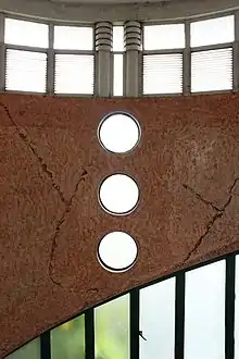 The handpainted glass with native Philippine scenes and modernist European figures adorn the rooms and bathrooms. On the second floor foyer, a steel oval viewing deck like on a cruise ship allows a peek at visitors arriving on the ground floor on their way to the formal living room or sala. On the wall next to the viewing "ship deck/hole" is an elaborate vista in bas relief depicting the patriarch's idealized world of a successful and bountiful land as a reward for the hardworking robust-looking farmer depicted on his favorite beast of burden, the carabao, surrounded by healthy looking women carrying the harvest leading to a cornucopia from the land. Relaxation from hard work is also included in this intricate vista depicted by a native man playing a harana (serenade) on the guitar.