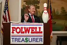 In December 2015, Folwell announced his candidacy for the Republican nomination for North Carolina State Treasurer in the 2016 election.[24] In the November 2016 election, Folwell faced Democratic nominee Dan Blue III, a consultant, lawyer, investment banker, and son of Dan Blue Jr.[25] Folwell won, receiving 52.7% of the vote to Blue's 47.3%.[26] Folwell took office on January 1, 2017.[27] He became the first Republican to hold the office since David A. Jenkins served during the Reconstruction era from 1868 to 1876.[28]
