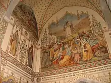 Inside, the church is completely dominated by the changes made in 1899–1914, but among the later additions there are several original, medieval details. The church for example has the oldest preserved stained glass windows on Gotland (made by a German artisan), but to these have been added complementing windows in medieval style during the 1899–1914 renovation.[2] Several medieval murals also survive, depicting e.g. the crucifixion and the archangel Michael. The walls are however dominated by the many paintings made by Haig during the renovation. A niche intended to house the bread and wine of the Eucharist, is actually a surviving fragment from the earlier, Romanesque church. The church also has a processional cross from the 14th century and a baptismal font from the 12th century, but almost all of the other furnishings stem from the great renovation of the church.[2]