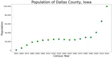 Dallas County is a county located in the U.S. state of Iowa. As of the 2020 Census, the population was 99,678, making it the seventh-most populous county in Iowa. Between 2010 and 2020, it was the fastest growing county in Iowa and one of the fastest growing in the country.[1] Its county seat is Adel,[2] and its largest city is Waukee. The county was named for George M. Dallas, Vice President of the United States under James K. Polk, the namesake of neighboring Polk County.
