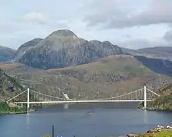 The Dalsfjord Bridge is a suspension bridge over the Dalsfjorden in Vestland county, Norway. The bridge connects the municipalities of Fjaler and Askvoll on either side of the fjord. The suspension bridge has a main span of 523 metres (1,716 ft) and the bridge towers are 101 metres (331 ft) high. It was opened on 14 December 2013. The bridge was built as part of the Dalsfjord Connection project and is part of Norwegian County Road 609. On the west side, the road enters the Otterstein Tunnel, while on the east side of the bridge the road enters a 290-metre (950 ft) tunnel arm into a roundabout inside the Nishammart Tunnel.[1][2]