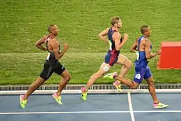In his first outing of 2013, Warner won at the high-profile Hypo Meeting with a score of 8307 points, including bests of 2.09 m in the high jump and 62.84 m in the javelin throw.[11] Following this, Warner went into the 2013 World Championships in Athletics; after the first day, he was in fifth place, but on the second day, he tied a personal best in the pole vault and threw a personal best in the javelin to fight his way into the bronze medal position.[12] After achieving his medal he said "This is such a great feeling, all the hard work my coaches and I put into this the last couple of years. In 2011 I finished 18th and saw the three medallists running around the track with their country's flags draped over their shoulders; I told my coaches that I want that to be me, pretty special feeling to achieve that."[12] Warner's final score of 8,512 was a new personal best and was the first time a Canadian reached the podium in the decathlon at the World Championships since Mike Smith in 1995. He ended his 2013 season with a win at the Decastar meeting with a tally of 8161 points.[13]