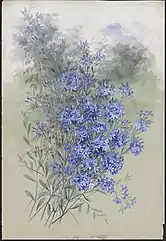 Floral buds grow during June and October. The petals (corolla) are blue or mauve and are usually 8 to 15 mm (0.3 to 0.6 in) in length. The petals are auriculate and do not have spurs. Both the inside and outside of the corolla are hairy; the outside hairs are particularly dense. The hairs of the corolla are pale grey.[4] The flowers of D. altissima are notable by the cup at the tip of the style. Each style is 4 to 4.5 mm (0.15 to 0.18 in) long and is smooth. The anthers at the tips of filaments are connate. On the flowers of D. altissima, bracteoles are present and cover the outside of the bud in its early stages of flowering. The bracteoles are hairy, obloid and are 4.5 to 5.5 mm (0.18 to 0.22 in) in length.[2][4] Dampiera altissima has epigynous flowers, with the ovary of each flower sitting below the petals. The plant has 1-2 ovules, which are upright.[5] The calyx lobes, each 1 to 2 mm (0.04 to 0.08 in) in length, are equally winged and have high density of hairs. The outer lobes are each 5.5 to 12 mm (0.22 to 0.5 in) in length and are unequally winged. The wings are 1.2 mm (0.05 in) wide on the narrower side of the outer lobe and 3 to 3.2 mm (0.12 to 0.13 in) wide on the broader side.[2] The pedicels are generally 3 mm (0.12 in) in length and are hairy. The inflorescence branches are usually 9 to 21 mm (0.35 to 0.83 in) in length).[5] There is one flower per floral axis.[5]