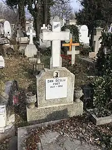 An excellent swimmer, Deșliu drowned at Neptun nearly three years after the Revolution; it is unknown whether his death was accidental or deliberate.[7] After a thorough search covering the 20 km (12 mi) between Costinești and Vama Veche, his intact body was found after eight days beside the dock of Ceaușescu's former villa in Neptun.[3] A diary of his, likely written in 1990–1991, appeared in 2001.[8] A street in 23 August, Constanța County bears his name, and he is buried at Bellu Cemetery in Bucharest.