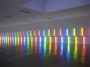 In the late 1970s, he began a partnership with the Dia Art Foundation that resulted in the making of several permanent site-specific installations and led most recently to the organization of the traveling exhibition, Dan Flavin: A Retrospective (2004–2007).[38] Flavin's retrospective exhibition traveled to the Museum of Contemporary Art, Chicago; the National Gallery of Art, Washington, D.C.; the Museum of Modern Art, Fort Worth, Texas; Hayward Gallery, London; Musée d'Art Moderne de la Ville de Paris, Paris; Bayerische Staatsgemäldesammlungen, Pinakothek der Moderne, Munich; and the Los Angeles County Museum of Art, Los Angeles.[39][40] This exhibition was the first comprehensive retrospective devoted to his minimalist work. The exhibition included nearly 45 light works, including his "icons" series. The MCA's presentation included the re-creation of the alternating pink and "gold" room from the original MCA exhibition in 1967, Flavin's first solo museum exhibition.[41]