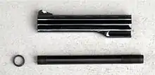 The Model 44 or Large Frame Dan Wesson was initially offered with 4", 6", 8", or 10" interchangeable barrel/shroud options,[6] and most guns shipped with a 6-inch barrel. A 2 1/2" barrel/shroud was later introduced, available as a separate option from the factory. Like the Model 15-2, the Model 44 could also be purchased with a variety of shroud configurations – either partial lug or full lug with a solid rib or ventilated-rib barrel. The Model 44 could also be obtained with a "Power Control" barrel compensator.[9] This was a stainless steel barrel drilled radially at the muzzle end with a series of small ports. Two small vents cut into the top of the barrel shroud vented excess gas and reduced apparent recoil of the gun, although this feature eliminated the option of using cast lead bullets due to lead and carbon accumulation. At the time, Dan Wesson M44 was the lightest recoiling .44 magnum ever produced.[2][7] Light recoil was a side benefit in IHMSA silhouette competitions. The Model 44's high level of intrinsic accuracy, combined with an excellent trigger, and fast lock time, caused a surge in popularity of the M44 in heavy-caliber revolver competition, though the gun was also popular with handgun hunters and sportsmen who desired a gun for personal protection against bears or other large predators. The Power Control barrel and vented shroud were eventually dropped, though DW did experiment with an external shroud-mounted compensator in later models.