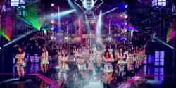 A distance shot of E-girls performing "Dance with Me Now!" in a night club, surrounded by on-goers. The dance sequence was heavily praised by critics.