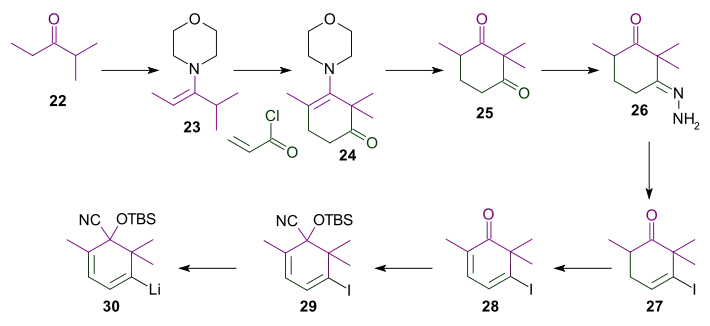 For this synthesis (Scheme 3) the morpholine enamine of ethyl isopropyl ketone was reacted with acryloyl chloride in a combined nucleophilic conjugate addition and nucleophilic acyl substitution to give after hydrolysis diketone 25. Reaction with hydrazine in triethylamine and ethanol afforded hydrazone 26. After an unusual hydrazone iodination that also involved iodination alpha to a carbonyl group and elimination of HI, fully conjugated vinyl iodide 28 was produced in an unexpected dehydrogenation. The ketone was converted into cyanohydrin 29 with trimethylsilyl cyanide, potassium cyanide and a crown ether.