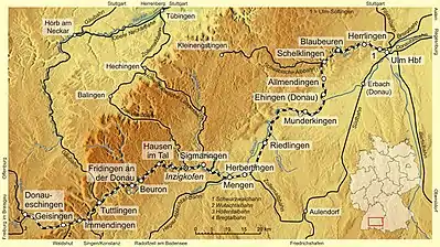 The Ulm–Sigmaringen railway runs alongside the Danube river and crosses it several times. At Ehingen (Donau), the line leaves what is known as the Danube valley today, and follows the valley formed by the Danube in times past, along the rivers Schmiech, Ach, and Blau. The railway touches the border of the Swabian Jura (Schwäbische Alb) between Allmendingen and Blaustein, and meets its eponymous river again at the line's terminus in Ulm.