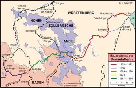 The Danube Valley Railway was never conceived as one comprehensive railway from Ulm to Donaueschingen, and certainly not all the way to Freiburg im Breisgau, but came together as individual pieces of several railway projects, which were constructed over the course of about 25 years. Especially the borders between the states of Baden, Württemberg, and the Province of Hohenzollern, which became part of Prussia in 1850, made such comprehensive railway planning difficult. In just the section between Mengen in Württemberg and Immendingen in Baden, the Danube Valley Railway crosses state borders a total of ten times. The section between Ulm and Immendingen was built by the Royal Württemberg State Railways (Königlich Württembergischen Staats-Eisenbahnen or K.W.St.E.), while the section between Immendingen and Donaueschingen was constructed by the Baden State Railways (Badische Staatseisenbahnen). Prussia did not take part in the construction of the line, even though parts of it do run across the areas belonging to the Province of Hohenzollern.