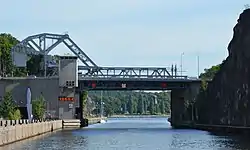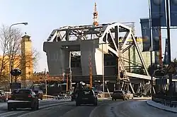 In 1922, a railway viaduct built in 1893 was demolished together with the old bridge, both replaced by a single-leaf bascule bridge with its concrete counterweight hanging over the 14 metres wide roadway shared by trains and vehicles. This bridge is a fixed-trunnion bridge type and a copy of a Joseph Strauss design.[3]