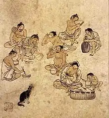Danwon pungsokdo cheop is an album of genre painting (pungsokhwa or pungsokdo) drawn by Kim Hong-do during the late Joseon dynasty. It was named after Kim's pen name, Danwon and comprises the 25 paintings in total. The album is painted with light watercolor on hanji (한지 Korean paper). Each painting depicts vividly common people's daily life in the Joseon period.