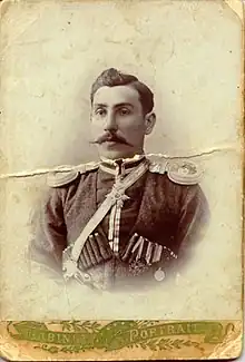 He participated in the First World War as the commander of the 5th hundred of the 1st line Regiment of the Kuban Cossack Army.[6] On 4 August 1914, he proved heroism in a battle near the village of Gorodok, personally commanding a hundred of 109 people, he made a horse attack on 3 squadrons of Austrians who were trying to surround them.[6] Although the number of the opposing side was much larger and despite the strong shrapnel fire of their artillery, he led a hundred to the enemy's front. About 3 Austrian squadrons were destroyed and thus the course of the battle was changed.[7][8] In this battle, Darab Mirza received a severe saber wound.[9]