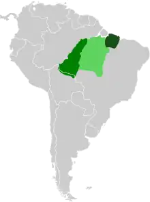 The dark-winged trumpeter is found in the Amazon Basin of Brazil south of the Amazon River. The nominate subspecies is the westernmost, found between the Rio Madeira and the Rio Tapajós. Subspecies P. v. dextralis is found from the Tapajós to the Rio Tocantins. (P. v. dextralis sensu stricto and P. v. interjecta are separated by the Rio Xingu when they are treated as individual subspecies.) P. v. obscura is found from the Tocantins to the Atlantic coast in the state of Pará.[2][3] Undocumented sight records in northeastern Boliva lead the South American Classification Committee of the American Ornithological Society to call the species hypothetical in that country.[8]