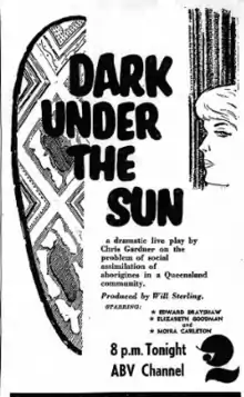 Dark Under the Sun is a 1960 Australian TV play. It was written by Brisbane author, Chris Gardner, who also wrote The House of Mancello (1962) and A Private Island (1964). Australian TV drama was relatively rare at the time. The play concerned an interracial romance which led Filmink magazine to think it was "an indication that Australian television was willing to confront some of the nation’s trickier social issues head on."[2] Other Australian TV plays to deal with racial issues included Burst of Summer.[3] However the Aboriginal character is played by a white actor in blackface.[4]