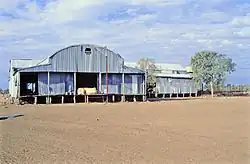 The document outlining improvements to the station records also that a woolshed was erected on the property c.1883. During the shearers' strike in 1891, a group of striking shearers unsuccessfully attempted to burn down the woolshed. A new woolshed appears to have been erected, possibly in the early 1900s, and is reputed to have formerly been a temporary pavilion/annexe for the c.1880 Melbourne Exhibition, which was dismantled and shipped to Rockhampton, then transported to Darr River Downs where it was re-erected as the woolshed. An official record of the Melbourne International Exhibition of 1880-1881 noted that the temporary annexes erected for the Exhibition were constructed of corrugated iron and timber, and the materials were subsequently sold at fair prices to the Victorian Railway Department to be utilised in building shed & c at railway stations. It is not clear whether all of the annexes were sold to the Railways Department, or whether some may have been disposed of elsewhere. It is also of interest to note that an A Fisken (presumably Archibald Fisken, a prominent Melbourne businessman who was involved with Darr River Downs during the late 1890s) was listed in the Exhibition record as one of the Commissioners of the Exhibition, and therefore may have been involved in acquiring one of the annexes for Darr River Downs. The woolshed was located just over one mile from the homestead, and included large holding pens for the sheep, and shearers' quarters.[1]