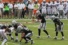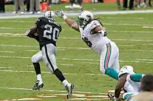 At training camp, McFadden impressed Raiders coach Lane Kiffin with his ability to take instructions once and seamlessly incorporate them into his game. Media observers considered him the most complete Raiders rookie at this stage since Marcus Allen.[65] On September 8, McFadden made his NFL debut against the Denver Broncos, where he had 46 rushing yards on 9 carries; the Raiders lost the game, 14–41. McFadden scored his first professional touchdown against the Kansas City Chiefs on September 14, 2008, his second NFL game, in which he gained 164 yards on 21 carries.[66] McFadden also suffered an injury to his big toe in this game, which limited him for the next 14 games, including three missed games. On November 23, in a game against the Broncos, McFadden scored two touchdowns, his first multi-touchdown game in his career. He ended the season with 499 yards on 113 attempts, with four touchdowns. He also made 29 receptions for 285 yards.[67] Raiders interim head coach Tom Cable, who took over after Kiffin was fired by owner Al Davis, was criticized for not playing McFadden later in the season. Responding to criticism, Cable stated “Well what really dictated was the rotation we were in, terms of the game, the flow of the game. I think [Justin] Fargas played pretty well. It’s just those situations present themselves."[68] Oakland Tribune writer Jerry McDonald responded to Cable's statement, saying "If the flow of the game means keeping McFadden, an excellent receiving back, off the field on third down plays which call for a pass, then the flow needs to be changed by the play-caller."[68]