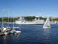 Dartmouth Harbour (also Dart Harbour) is a natural port located in Dartmouth, Devon, England. It is situated at the mouth of the River Dart on the English Channel.[2] Bayard's Cove Fort is a small fort, which was built to defend the harbour's entrance. The crafts which dock at the port are mainly local fishing vessels, naval ships and luxury yachts; warships routinely visit the harbour.[3] The River Dart is navigable from Dartmouth to the old weir location at Totnes.