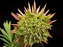 Darwinia acerosa is a spreading, densely-branched, heath-like shrub with whitish branches which grows to a height of 30–50 centimetres (10–20 in). It has crowded, finely-pointed leaves which are about 1 centimetre (0.4 in) long, 1 millimetre (0.04 in) wide, triangular in cross-section and often have a hooked tip. The flowers are arranged in drooping, hemispherical heads of 40 to 50 greenish-yellow flowers. The heads are about 1.5 centimetres (0.6 in) in diameter and are surrounded by rows of green bracts that are longer than the flowers.[3][4]