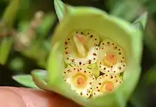 The flowers are arranged near the ends of the branches in groups of 10 to 14, each group surrounded by broad, glabrous, egg-shaped yellowish-green to pinkish-red bracteoles up to 30 millimetres (1 in) long. Individual flowers within this bell-like inflorescence are tubular, have blunt-tipped, egg-shaped petals, 4 millimetres (0.2 in) long and 2 millimetres (0.08 in) wide. Flowering occurs between October and December and is followed by fruit which is a small, non-fleshy nut.[2]