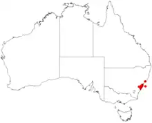 A rare species found in heathlands or dry sclerophyll forest in eastern New South Wales between Manly, Ingleside, Loftus and Helensburgh where it grows in poorly drained sandy soils.[2]