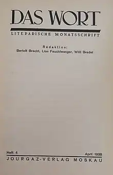 Das Wort (German: The Word) was a monthly literary magazine which was published in Moscow in the period between 1936 and 1939. The magazine is known for its editors, including Willi Bredel, Lion Feuchtwanger, and Bertolt Brecht. Its subtitle was Literarische Monatsschrift (German: Literary Monthly).[1]