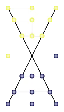 The board consist of two triangles connected together at a common vertex. Players play on opposite sides of the board with the base of each triangle forming the first rank of each player. Two lines cross the breadth of each triangle forming the second and third ranks respectively of each player. The common vertex and two line segments one on each side of the common vertex but exterior to both triangles form the fourth rank of each player. The common vertex is also the central point of the board. A single line perpendicular to the base of each triangle runs through the common vertex. There are a total of 19 intersection points and 2 endpoints (both hereforth referred to as "points") for a total of 21 points. Pieces are situated on the points, and move along the lines.