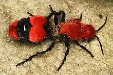 Dasymutilla occidentalis (red velvet ant, eastern velvet ant, cow ant or cow killer)[2][3][4] is a species of parasitoid wasp native to the eastern United States. It is commonly mistaken for a member of the true ant family, as the female is wingless. The species ranges from Connecticut to Kansas in the north and Florida to Texas in the south.