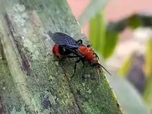 Commonly mistaken for an ant, because of its appearance and its common name, it is a parasitoid wasp species in which the females are wingless, as is true for all females of Mutillidae. It can be recognized by its distinctive red coloring, with a black stripe that goes across the abdomen.[4] They are quick-moving and often take a defensive posture when threatened. Instead of creating nests, the females seek out the brood cells of Eastern cicada killers and horse guard wasps as well as other large ground-nesting members of Crabronidae, where they deposit an egg onto a host larva. The egg quickly hatches into a white, legless grub, which consumes the host and goes through several larval stages prior to pupation. Unlike the females, males have dark, translucent wings and do not possess a sting.[5][2][3] Males fly low over grass in search of mates. Both sexes make a squeaking noise (stridulation) to warn potential predators (another form of aposematism in females, and automimicry in males).[6]