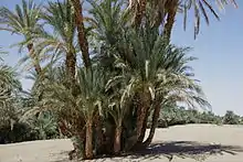 In order to multiply the number of fruit-bearing trees traditional offshoot propagation is practised all along the Nile in Sudan. Lower offshoots called Shatla (شتلا) develop from axillary buds at the lower trunk of a parent palm and are cut off during early spring season. A well chosen offshoot will not only guarantee a female fruit bearing palm tree but also inherit the same qualities of its mother plant.[5] The date trees in the region of the Fourth Cataract attain an age of up to 150 years and consist most often of multiple shoots from a single clump called Bu'rah or Hufrah (بؤرة or حفرة).[6] Satisfactory date production ceases with an age of 90 to 100 years. With increasing age and height the palm tree becomes more difficult to climb in order to be pollinated and harvested.