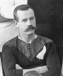 Gallaher played eight matches – the first four as hooker and the remainder as wing-forward[lower-alpha 3][58] – out of eleven during the six-week tour. The party was captained by the veteran Otago player Jimmy Duncan, who was widely recognised as a master tactician.[59] The first match in Australia, against New South Wales, was won 12–0 by the New Zealanders, despite their having a man sent off.[60] After playing a Combined Western Districts side, New Zealand played a second match against New South Wales. New Zealand won again, but only 3–0 on a flooded pitch at Sydney Cricket Ground.[61] The side continued touring the state before making their way north to Queensland, where they twice played the state side. The New Zealanders then returned to New South Wales, where the first-ever Australia–New Zealand rugby union Test match took place in Sydney.[62]