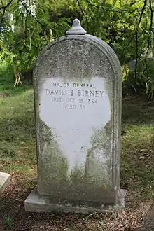 Birney started in the Overland Campaign as a division commander in the II Corps, his III Corps having been reorganized out of existence that spring. After good service in the Wilderness, Spotsylvania Court House (where he was wounded by a shell fragment), and Cold Harbor battles, on July 23, 1864, Lt. Gen. Ulysses S. Grant gave Birney command of the X Corps in the Army of the James. During the Siege of Petersburg, Birney became ill with diarrhea. At first, this was a minor complaint and he was able to remain in command, but in September his health started to get worse. However, Birney was reluctant to take a leave of absence and so tried to remain on duty. On October 7, he was so sick that he had to be transported in an ambulance. The corps medical director requested that Birney be sent home at once, and he was taken to Philadelphia, where he became delirious. The doctors diagnosed his condition as typhomalaria, and he died on October 18 after experiencing uncontrollable gastrointestinal bleeding. The exact cause of Birney's death has been speculated to be typhoid fever. He was buried in Woodlands Cemetery.