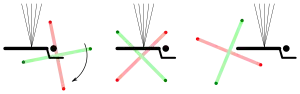 John Gaughan described how the trick works in US Patent #5,354,238.[1][2] According to the patent, the performer is supported by two fan-shaped arrays of fine wires that remain invisible to the viewing audience.[6] The wires are about 0.25 millimetres (0.010 in) thick, and support about 10 kilograms (22 lb) each; the arrays contain more than enough wires to support the performer's weight. The wire arrays are mounted at the hips, near the human center of mass, to a harness worn under the clothing. This creates a balance point facilitating a wide range of movements while suspended. The wires are attached to a complex computer-controlled rig above the stage that maintains the tension in each wire, and keeps each array of wires perpendicular to the audience's line of sight so that the wires never overlap one another, which might allow the audience to see them.
