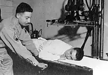 A U.S. Army Air Force Staff Sergeant Radiologic Technologist (Radiographer) positions a patient for an X-ray at the 4167th Station Hospital at Fairfield-Suisun Army Air Field during WWII, circa 1943-1945