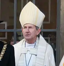 His ordained ministry as a curate at St Andrew's Bebington,[6] after which he was spent six years in Nigeria. He was then vicar of St George's Leeds[7] for 16 years until his ordination to the episcopate. On 17 October 2002, at Southwark Cathedral, he was one (with Richard Cheetham and David Hamid) of the last three people to be ordained and consecrated a bishop by George Carey before his retirement as Archbishop of Canterbury.[8][9] He was installed at Chelmsford Cathedral in January 2003[1] and retired on 30 March 2014.