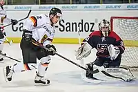 As an unsigned free agent, Leggio accepted a tryout offer from the Winnipeg Jets on August 28, 2015.[10] Upon his release from the Jets, Leggio opted for a second stint in Europe, agreeing to an initial one-year contract with German club EHC München of the DEL on October 22, 2015.[11] While in Munich, Leggio pulled the same intentional dislodging of the goalposts (as the DEL had not yet outlawed the maneuver) in a game against the Fischtown Pinguins on December 9, 2017.[12][13] The DEL changed its rules immediately thereafter, automatically awarding a goal if the net is intentionally dislodged.[1] Leggio was also fined an undisclosed amount for the play.