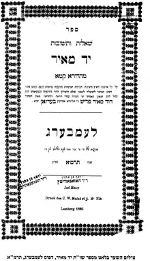 The "Yad Meir" (translated "Hand of Meir") was published in Lemberg (now Lviv) in 1881, in the year before his passing. It contains 56 responsa (Nos. 1 to 57, with No. 32 missing), most of them addressed to well-known talmudic scholars of his time, including his sons. The numerical value of the Hebrew word "yad" is 14, the same as the value of "David", the author's first name. "Yad" is also the acronym of "Yad David", while Meir is the author's middle name.[22]