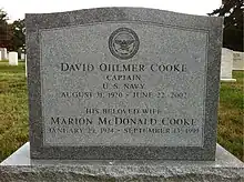 On June 22, 2002, Cooke died from injuries that were a result of a car accident on June 6. He is buried at Arlington National Cemetery in Virginia, overlooking the Pentagon. His wife of 52 years, Marion McDonald Cooke, died in 1999. The couple had raised three children, Michele C. Sutton of Springfield, David Cooke and Lot Cooke, both of Fairfax. He also had two grandchildren at the time of his death. Elizabeth M. Cooke, who was born in 2000, and David B. Cooke who was born in 2002 a week before Cooke's death (both children from David O. Cooke Jr.).