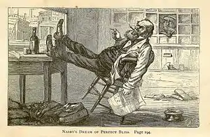 The Nasby Letters, although written in the semi-literate spelling used by other humorists of the time, were a sophisticated work of ironic fiction. They were consciously intended to rally support for the Union cause; "Nasby" himself was portrayed as a thoroughly detestable character – a supreme opportunist, bigoted, work-shy, often half-drunk, and willing to say or do anything to get a Postmaster's job. (Locke's own father had served as Postmaster of Virgil, New York.)[9] At the time the Letters were written, postmaster positions were political plums, offering a guaranteed federal salary for little or no real work. Until the glorious day when he received a "Post Orfis" from Andrew Johnson, Nasby worked, when he worked, most frequently as a preacher. His favorite biblical texts, unsurprisingly, were the ones that were used by Southern ministers to "prove" that slavery was ordained by the Bible.