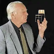 David Rowland holding a scale model of his masterpiece 40/4 chair