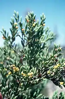 Daviesia crassa is a compact, dense, glabrous shrub that typically grows to a height of 1.8 m (5 ft 11 in) and has spreading to erect and often zig-zagging branchlets. Its leaves are reduced to crowded, thick, club-shaped phyllodes mostly 10–40 mm (0.39–1.57 in) long and 2–6 mm (0.079–0.236 in) wide. The flowers are mostly arranged in groups of three to five in leaf axils on a peduncle 3.5–6.0 mm (0.14–0.24 in) long, each flower on a pedicel 2–4 mm (0.079–0.157 in) long with egg-shaped bracts 0.5–1 mm (0.020–0.039 in) long at the base. The sepals are 4–5 mm (0.16–0.20 in) long and joined at the base, forming a bell-shaped base, the two upper lobes joined for most of their length and the lower three minute. The flowers are uniformly yellow, the standard broadly egg-shaped, 4.0–4.5 mm (0.16–0.18 in) long and 5.5–6 mm (0.22–0.24 in) wide, the wings spatula-shaped and about 4.5 mm (0.18 in) long and the keel about 4.5 mm (0.18 in) long. Flowering has been observed in January and the fruit is a flattened, triangular pod about 20 mm (0.79 in) long.[2][3]
