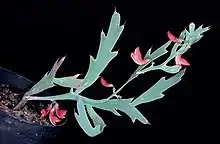 Daviesia epiphyllum is a rigid, erect and spreading, glabrous shrub that typically grows to a height of 0.3–1.5 m (1 ft 0 in – 4 ft 11 in). Its branches are reduced to flattened, staghorn-shaped phylloclades 5–20 mm (0.20–0.79 in) wide, the leaves reduced to oblong phyllodes 3–12 mm (0.12–0.47 in) long and 3–8 mm (0.12–0.31 in) wide with cuspidate, sharply-pointed tips. The flowers are arranged in groups of three to seven on a peduncle 1–2 mm (0.039–0.079 in) long, the rachis 2–4 mm (0.079–0.157 in) long, each flower on a pedicel 4–10 mm (0.16–0.39 in) long with many overlapping bracts about 5 mm (0.20 in) long at the base. The sepals are 9–10 mm (0.35–0.39 in) long and joined at the base, the two upper lobes joined for most of their length and the lower three triangular. The flowers are yellowish-red, the standard broadly elliptic with a deep notch, 23–25 mm (0.91–0.98 in) long and 4.5–5.5 mm (0.18–0.22 in) wide, the wings about 24–26 mm (0.94–1.02 in) long, and the keel about 23–29 mm (0.91–1.14 in) long. Flowering occurs from January to May and the fruit is a leathery, triangular pod 18–21 mm (0.71–0.83 in) long.[2][3]