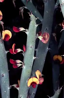 Daviesia euphorbioides, commonly known as Wongan cactus,[2] is a species of flowering plant in the family Fabaceae and is endemic to a restricted area in the south-west of Western Australia. It is an open, erect to sprawling, cactus-like shrub with thick, fleshy branchlets and phyllodes reduced to scattered, sharply-pointed spines, and bright yellow, reddish-brown and maroon flowers.