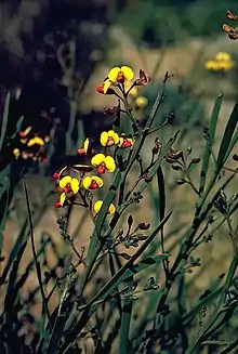 Daviesia longifolia is a bushy, many-stemmed shrub, typically 30–70 cm (12–28 in) high and about 1–3 m (3 ft 3 in – 9 ft 10 in) wide with weak, tangled branchlets. Its phyllodes are scattered, erect, cylindrical, snaking or curved, up to 250 mm (9.8 in) long and 1–10 mm (0.039–0.394 in) wide with six or more parallel ribs. The flowers are arranged in racemes of four to fifteen in leaf axils on a peduncle usually 10–17 mm (0.39–0.67 in) long, the rachis mostly 6–28 mm (0.24–1.10 in) long. The sepals are 3–4 mm (0.12–0.16 in) long and joined at the base, the upper two lobes joined for most of their length and the lower three about 0.5 mm (0.020 in) long. The standard petal is egg-shaped with a notch at the tip, 6.5–9 mm (0.26–0.35 in) long, yellow and dark red with an oblong yellow mark at the centre. The wings are 6.5–8 mm (0.26–0.31 in) long and dark red, and the keel 4.5–6.0 mm (0.18–0.24 in) long and deep red. Flowering occurs between August and December and the fruit is a flattened triangular pod 7–12 mm (0.28–0.47 in) long.[2][3]