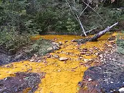 Acid mine drainage (AMD), occurring at abandoned mines, is a water problem characterized by low pH and high levels of metals.[11] An interdisciplinary research team from the University of Massachusetts Amherst is studying why the AMD from the abandoned sulfide mine is slowly cleaning itself over time. The group brings together experts from the fields of microbiology, geology, engineering, and science education, to determine the extent and rate of bioremediation.