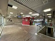 The station is on three levels: the entrances are located on street level, the concourse and collector booths are on the mezzanine (second) level, and the subway platforms are on the lower level.