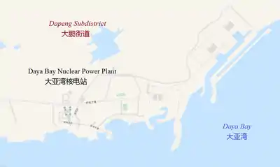 Daya Nuclear Power Plant (Chinese: 大亚湾核电站; pinyin: Dàyàwān Hédiànzhàn) is a nuclear power plant located in Daya Bay in Longgang District, along the eastern extremity of Shenzhen, Guangdong, China; and to the north east of Hong Kong. Daya Bay has two 944 MWe PWR nuclear reactors based on the Framatome ANP French 900 MWe three cooling loop design (M310), were both commissioned in 1993 and started commercial operation in 1993 and 1994 respectively.[4][1][2]