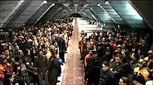 Galactica is set upon by Cylon boarding parties arriving in "platoon strength", as reported to Tigh and Adama in the CIC. As Starbuck, Apollo, Athena and Helo return to the battlestar and make their way to CIC, they encounter a boarding party composed of Cavil's modern Centurions and original Cylon War models. Hera runs away in the confusion. She is spotted by Roslin, who had a vision of her while assisting with triage, and is able to hide her from the Cylons, until she disappears again. While Roslin gives chase, Baltar and Caprica Six also spot Hera and give chase as well. The chase parallels the Opera House vision shared between Athena, Roslin and Caprica Six.[3] The chase ends in the CIC, where Cavil (Dean Stockwell) takes her hostage and demands to leave with Hera so she can be dissected and establish a method for Cylons to reproduce. Inner Six and Inner Baltar again appear jointly to Baltar, inspiring him to make the speech his entire life has led to, saying, among other things, that he sees angels,[4] and that a divine force ("whether God or Gods") has entwined the destinies of both sides. Tigh provides the final incentive, saying that the Final Five will give the Cylons back resurrection (a solution to the problem of Cylon extinction) if they vow to forever go separate ways from humanity and end their pursuit. Combined, this convinces Cavil and Adama to end the war, Cavil gives Hera back and will let them leave in peace when the Final Five give the technology for resurrection.